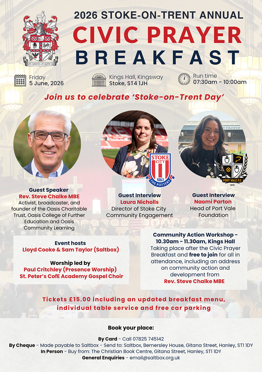 Join us for the 2026 Stoke-on-Trent Civic Prayer Breakfast, taking place at Kings Hall, Stoke, ST4 1JH, on Friday 5th June.
